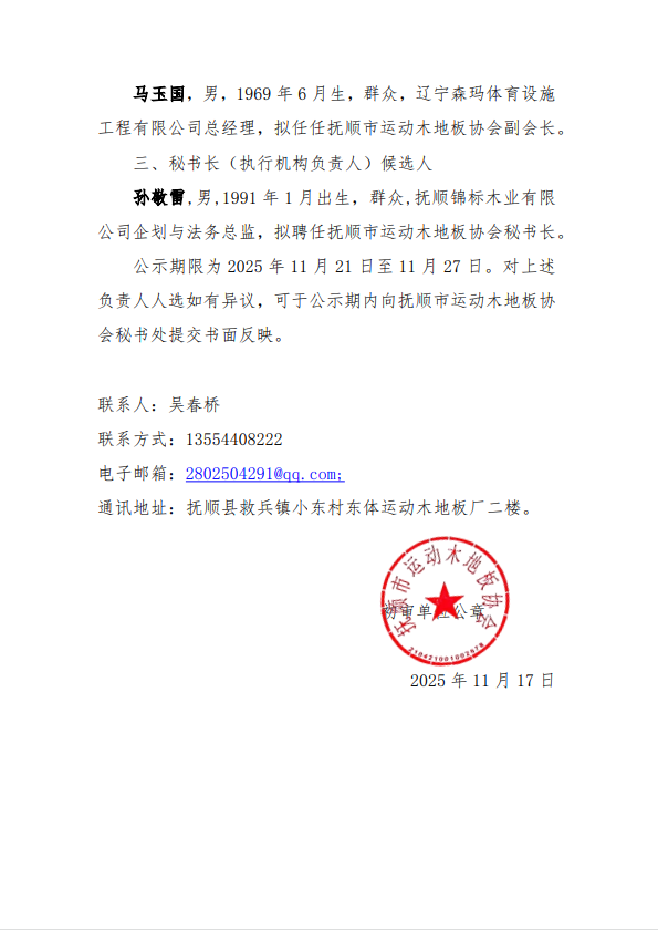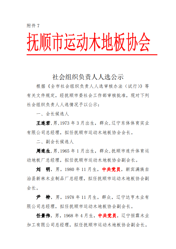 抚顺市运动木地板协会-社会组织负责人人选公示